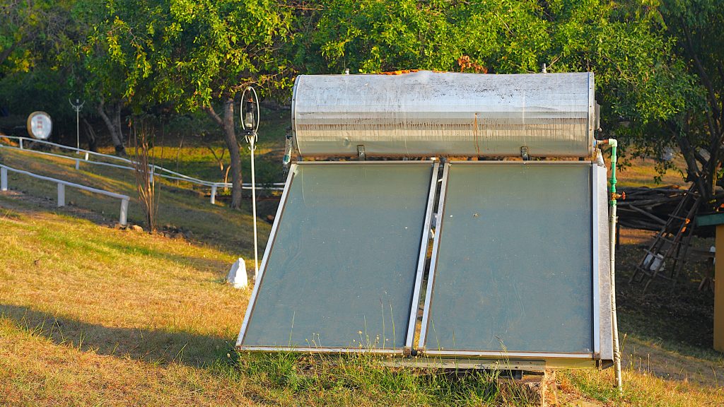 Solar water heater stands on a grassy hill, capturing sunlight for sustainable energy.